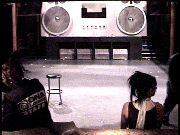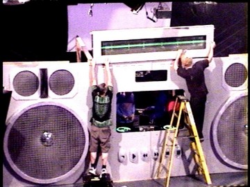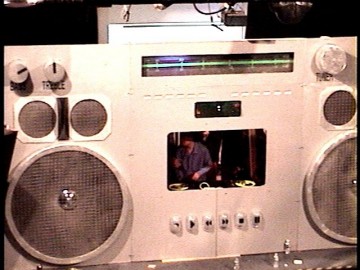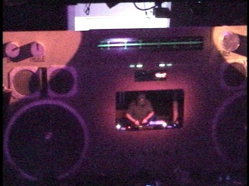 At the Adam Freeland show, someone brought in a giant boombox. And by "giant" I mean "filled the whole stage!" It's an easy guess that this was something left over from Burning Man, but it was exactly the right size for our stage: it looked like it had been built for us. The DJ stood in the place where the cassette door would have gone, and the VU meters above him were actually hooked up to the mixer, so they were accurate. It was pretty cool. I didn't have my camera with me that night, so here are a few shots I pulled off the webcast (mostly taken after closing):