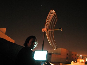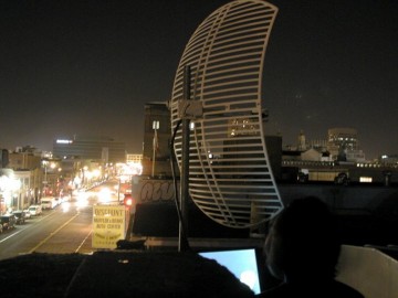 We were still messing around with the dish after dark, when the club was open. So at one point, John and I were picking our way across the steeply-angled roof, and he said, "wow, this is so much like being back at Burning Man: it's dark, it's cold, we're filthy, we're trying not to trip on something and die, we're out here with a laptop trying to debug the network, and there's loud bass thumping from somewhere nearby." It made me nostalgic, it really did.