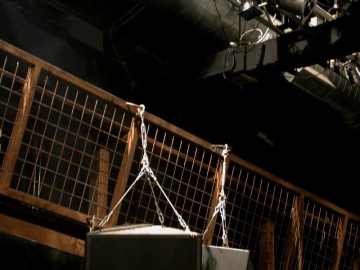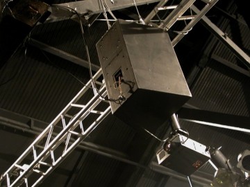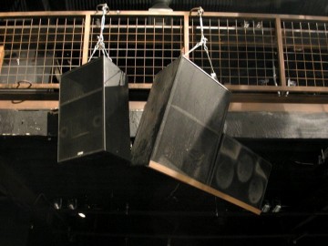 Last week, our center speaker cluster became our center speaker. We really didn't need that much muscle up there just to take care of the balcony, so we took two of the speakers down to use as side-fills on the stage. We had been using our live-show stage monitors as side-fills on dance nights, and hauling them up and down every time we had a live show, so this is a lot more convenient.