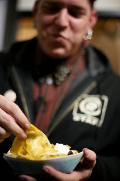 We're not serving full meals yet; our initial menu consists of nachos, quesadillas, and rice krispy treats. See, we've got a pretty decent menu planned out, but to buy the additional equipment needed to make that food, not to mention stocking the food itself, is gonna cost a few thousand dollars, which we don't have. So we finally said, "fuck it, let's see what we can do with a hundred bucks and just get this thing open." So Chef Sundance is up there making nachos for you all. Head up and say hi...