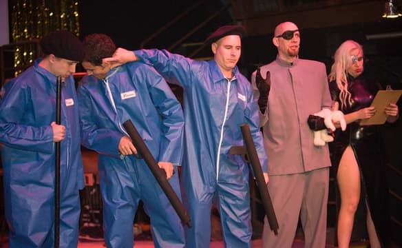 Since it was the Hubba Hubba spy show, we got matching jumpsuits made for most of the staff and crew. The awesome thing about them, which unfortunately doesn't show up in the photos, is that they all had this image stenciled on the back: VOLCANO FORTRESS