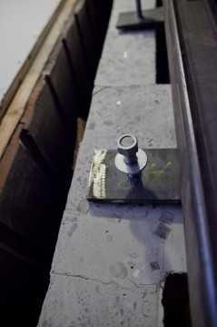 It's one big girder with a long flange on top that bolts to the wall above the door-hole, and it weighs about 500 pounds. It goes between the upright concrete pillars in the wall, which means it had to penetrate into the bathroom, which made quite a mess of the tile.