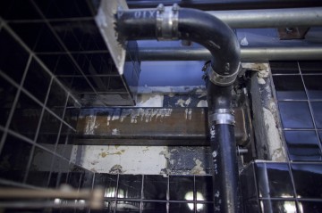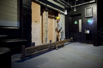 That flat concrete section you see there is where the wall was cut: that's a cross-section of the poured wall, and the darker spots are the rocks, gravel and rebar inside the wall. It's completely smooth to the touch. That saw was a no-joke saw. The gap you see is the space between the two buildings. Those stray pieces of wood sticking out in the first picture are the (former) outside wall of DNA Pizza from before DNA Lounge existed; and the jankier wood you see in the third picture is the remains of the lumber that they used as the mold when pouring DNA Lounge's concrete wall.