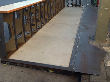 Today we installed the hinged diamond-plate flap to cover the drainage gap between the parklet and the sidewalk. It has a pretty wonky shape because our sidewalk has a pretty wonky shape. It had to be this wide in order to be level. It's pretty heavy, but it flips up to let us clean the gutter and for access to the various utility vaults buried in our sidewalk.