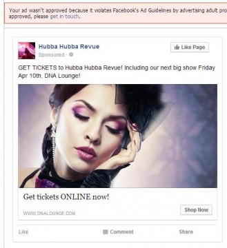 I was just trying to say that it didn't seem like the image was the key to the rejection, it was the underlying product--even though they were not saying so, which I agree is a passive-aggressive dick move on their part. But now you add that other burlesque shows are allowed to advertise, so yes Facebook does appear to be arbitrary and unfair.