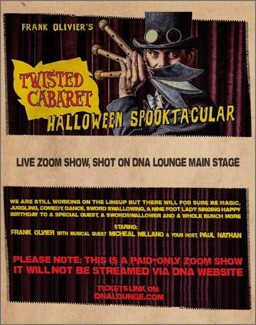 This one's a little different: it's streaming live from the DNA Lounge main room, but it's a paid-only Zoom show. See the calendar for details. - Saturday, October 31st, 7pm: