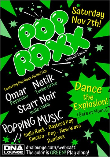 Back in the heyday of Indie Dance, there was a monthly, color-coordinated explosion called Pop Roxx! Join Pop Roxx alumni DJs Omar, Netik and Starr Noir for a virtual Pop Roxx Reunion! Dance The Explosion! The color is green.