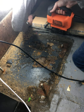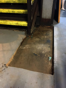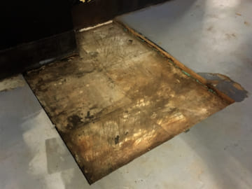 Sometimes we get soft spots in the floor, typically where liquids pool and can't evaporate. The floor underneath the photo booth got particularly destroyed, after only a couple of years of the booth sitting there. And the floor under the ATM was also pretty bad. When that happens, sometimes we can just use this stuff called "Rot Stop" which is a two part epoxy that is runny enough to penetrate pretty deeply into the wood and makes mushy, soft wood as hard as a rock. It's pretty magical.