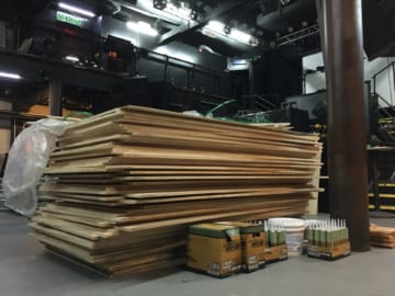 After repairing some soft spots in the old floor, we laid down a new layer of 3/4" birch. That is the same hardwood that we used on the go-go boxes and the Dazzle dance floor, which have held up exceptionally well. It turns out that we didn't need to tear up the old floor first. The new layer is glued and screwed on top of the old floor, which means that you are all now 3/4" taller.