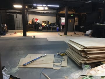The existing floor was a festive pancake of concrete, then a quarter inch of neoprene for springiness, then two layers of plywood. After two decades of dancing, the old plywood was extremly torn up, meaning the surface was rough and splotchy and paint would no longer stick to it well. It was a finished surface but a soft wood, probably pine or Douglas fir.