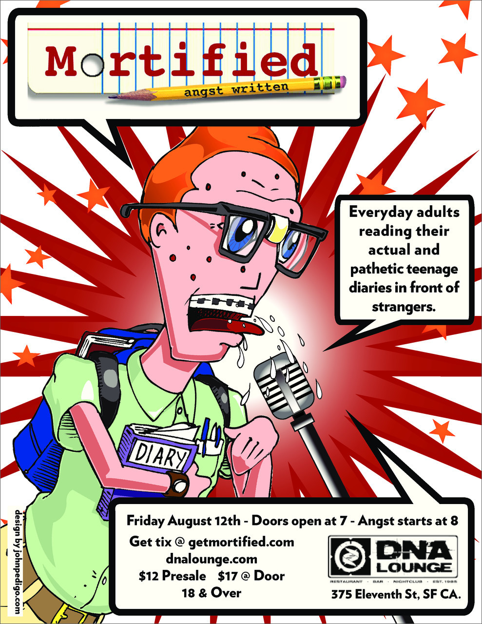Entertainment Weekly, Mortified is a comic excavation of the strange and extraordinary things we created as kids. Witness adults sharing their most embarrassing adolescent journals, letters, poems, lyrics, plays, home movies, and art... in order to reveal stories about their lives. Hear grown men and women confront their past with tales of their first kiss, first puff, worst prom, fights with mom, life at bible camp, worst hand job, best mall job, and reasons they deserved to marry Jon Bon Jovi.