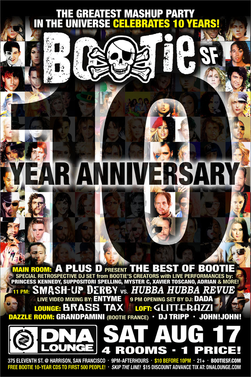 Launched in 2003 by San Francisco DJ duo A Plus D, Bootie SF was the first club night dedicated solely to the then-burgeoning artform of the bootleg mashup -- and is now the biggest mashup event in the world, with regular parties in several cities on four continents. Voted "Best Club Night" for the past eight years, Bootie celebrates pop culture both past and present, keeping your brain guessing and body dancing with creative song combinations. Mixing and matching every musical genre, era, and style into one big dance party, it's a place where everyone is welcome. And with free mashup CDs given away like candy, Bootie provides the soundtrack for the A.D.D. generation.