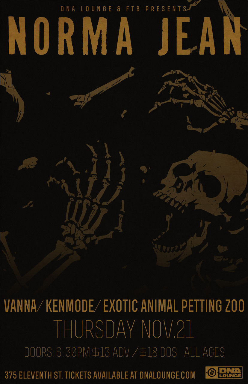 Atlanta-based Norma Jean (est. 1997) is a fine example of metal at its most pure. Cory Brandan roars into the mic, while guitarists Chris Day and Jeff Hickey keep the sound going and Clayton "Goose" Holyoak (drums) and John Finnegan (bass) pound away with a brutal beat. In 2006, Norma Jean was nominated for a Grammy for Best Recording Package for their album O' God, the Aftermath. Since then, they've successfully put out several albums and continued to win fans with their intense on-stage performances.