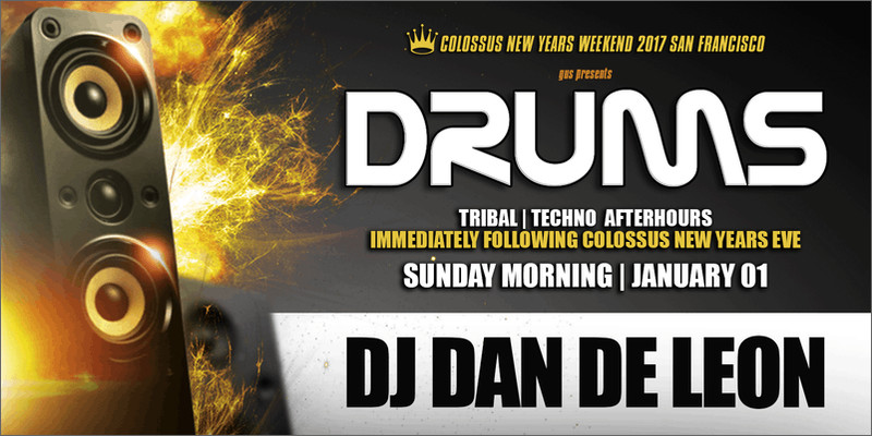 promptly at 3AM. Dance till you drop. I mean 9AM on New Year's Day! Drums is included in our specially-priced Colossus New Year's Weekend Passes. Pass holders enjoy express entry to the party.