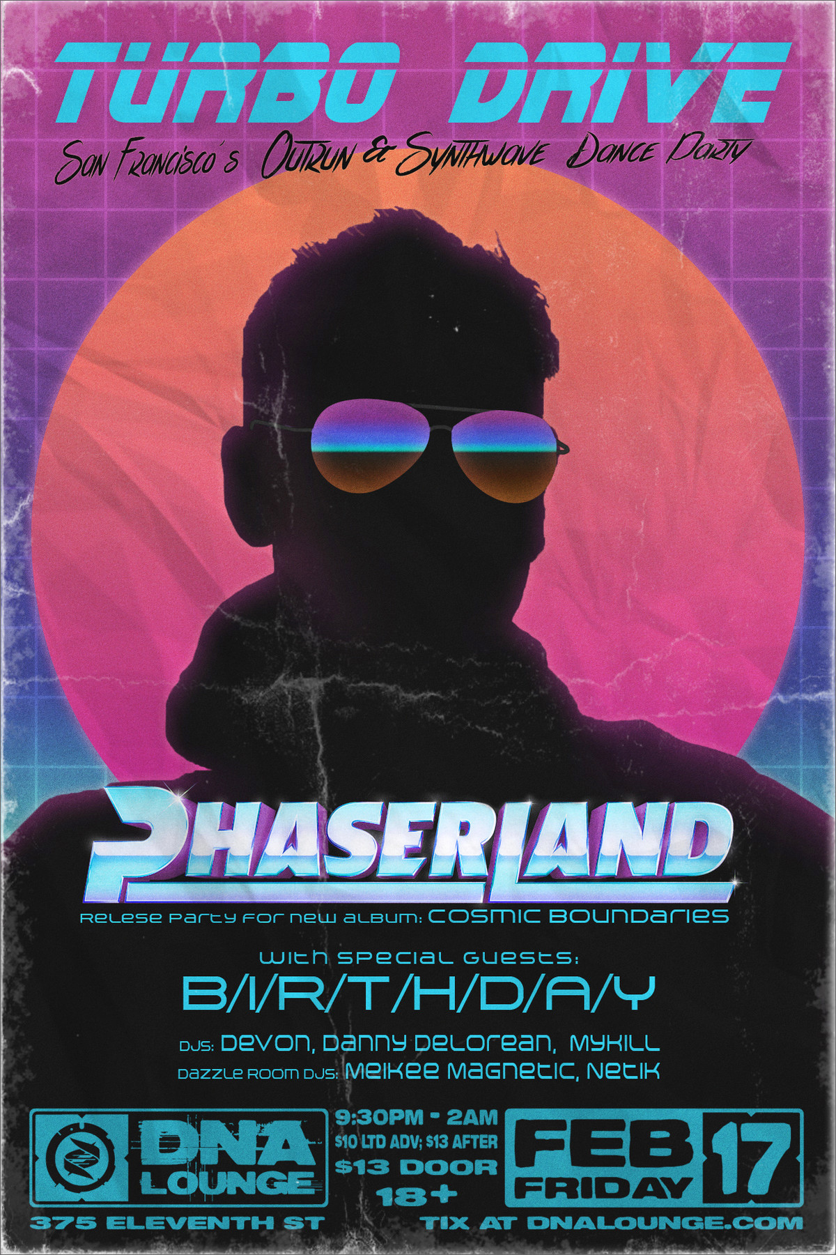 DJs spin music by artists like: Kavinsky, Carpenter Brut, Perturbator, Dance with the Dead, Com Truise, Gost, Robert Parker, Cut Copy, Barretso, Lazerhawk, Chromeo, College, Anoraak, Electric Youth, Miami Nights 1984, 80's Stallone, Tesla Boy, DVAS, Futurecop!, The Outrunners, FM Attack, Flashworx, Mitch Murder, Noir Deco, Garth Knight, Power Glove, Protector 101 and much more!