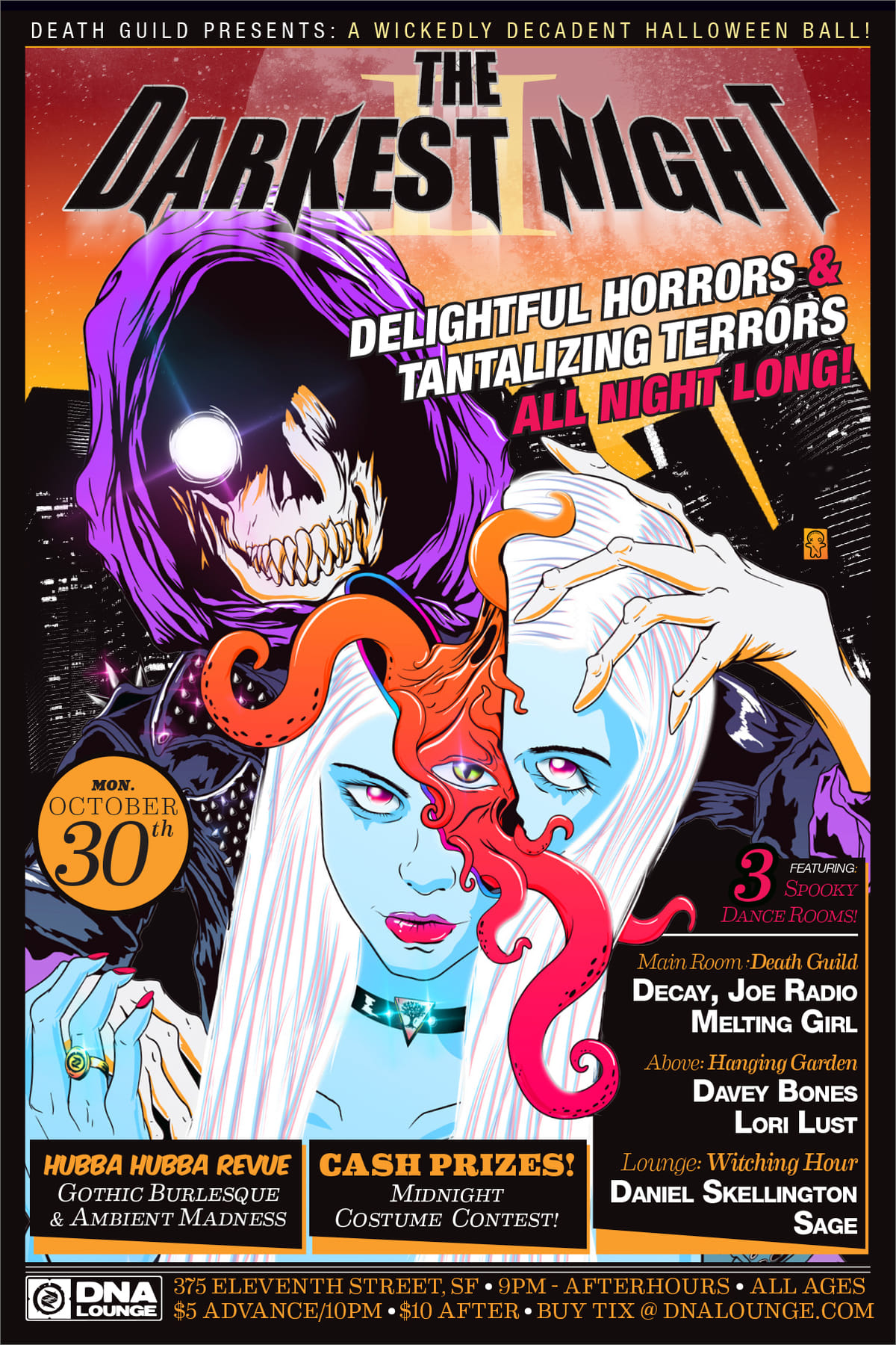 Death Guild is the oldest weekly goth/industrial dance night in the country, and the second oldest in the world! Every Monday, six DJs in two rooms play a mix of gothic, industrial, synthpop, noise, ambient, and weird stuff for those who love the darker side of things.