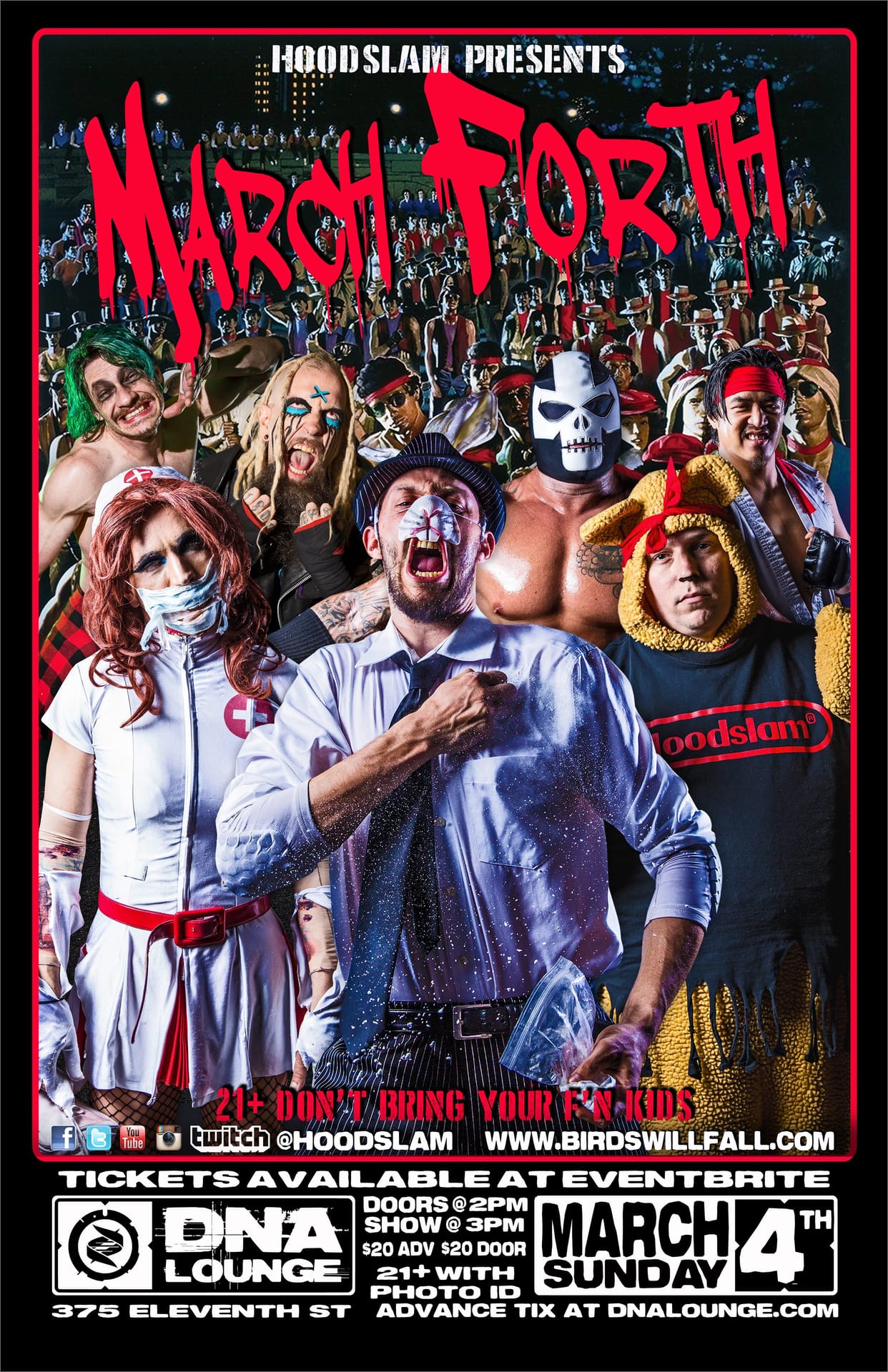 Hoodslam mixes cartoonish violence, ridiculous storylines and pure athleticism with copious amounts of obscenity to create one of the most unique nightlife experiences you are ever likely to see! Hoodslam does not just exceed expectations of what wrestling can be, it exceeds expectations of what an entertaining night out should be. Using nostalgia and bizarro costumes to play outside the traditional dichotomy, it doesn't just stick to the illusion of pro-wrestling, it plays with it in a way that takes it to unforeseen levels. Rather than trying to convince the audience that anything is real, they go so ridiculously over the top with this complicated charade that the audience can't help but go along and be both enthralled and bewildered with the incredible feats of athleticism and oddball theatricality taking place before their eyes.